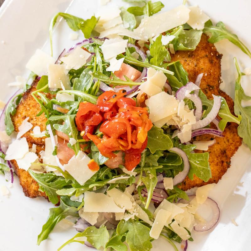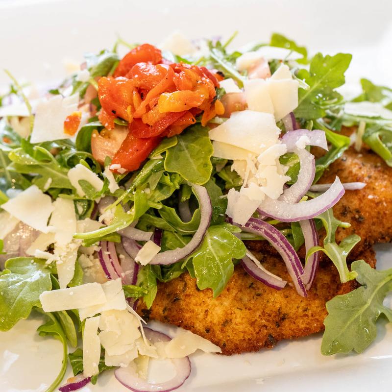 Half $50.00 | Full $90.00 • Breaded chicken, arugula, tomatoes, fresh mozzarella on the side.
