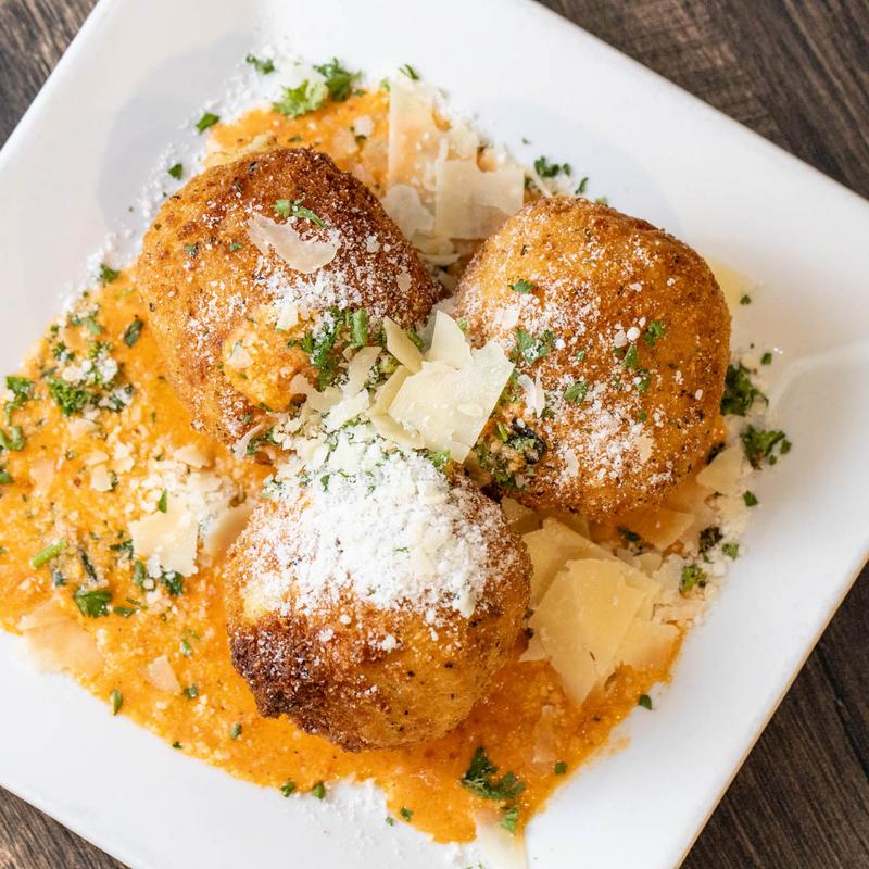 Cheese rice balls with peas served with tomato or vodka sauce.
