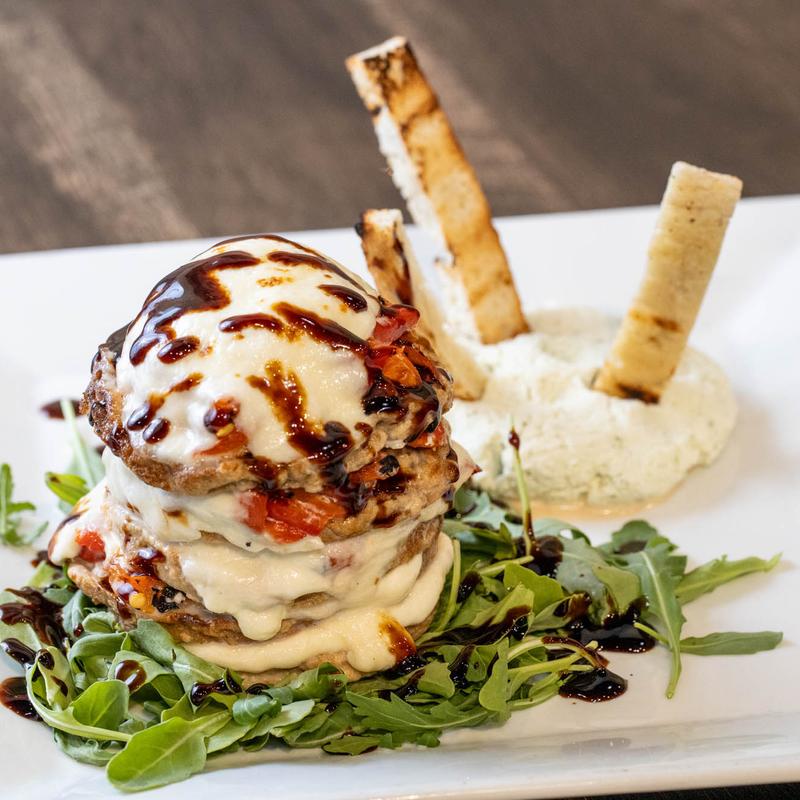 Crispy eggplant, homemade fresh mozzarella, roasted peppers, balsamic glaze & pesto ricotta.